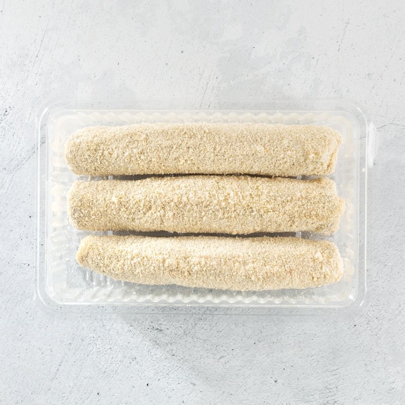 El flamenquín de ciervo es un producto elaborado, enrollado en carne de ciervo y relleno de panceta, magro y jamón, exquisito debido al gusto que le da la carne de caza, se presenta congelado en tarrinas de tres unidades, listo para freír y servir.
